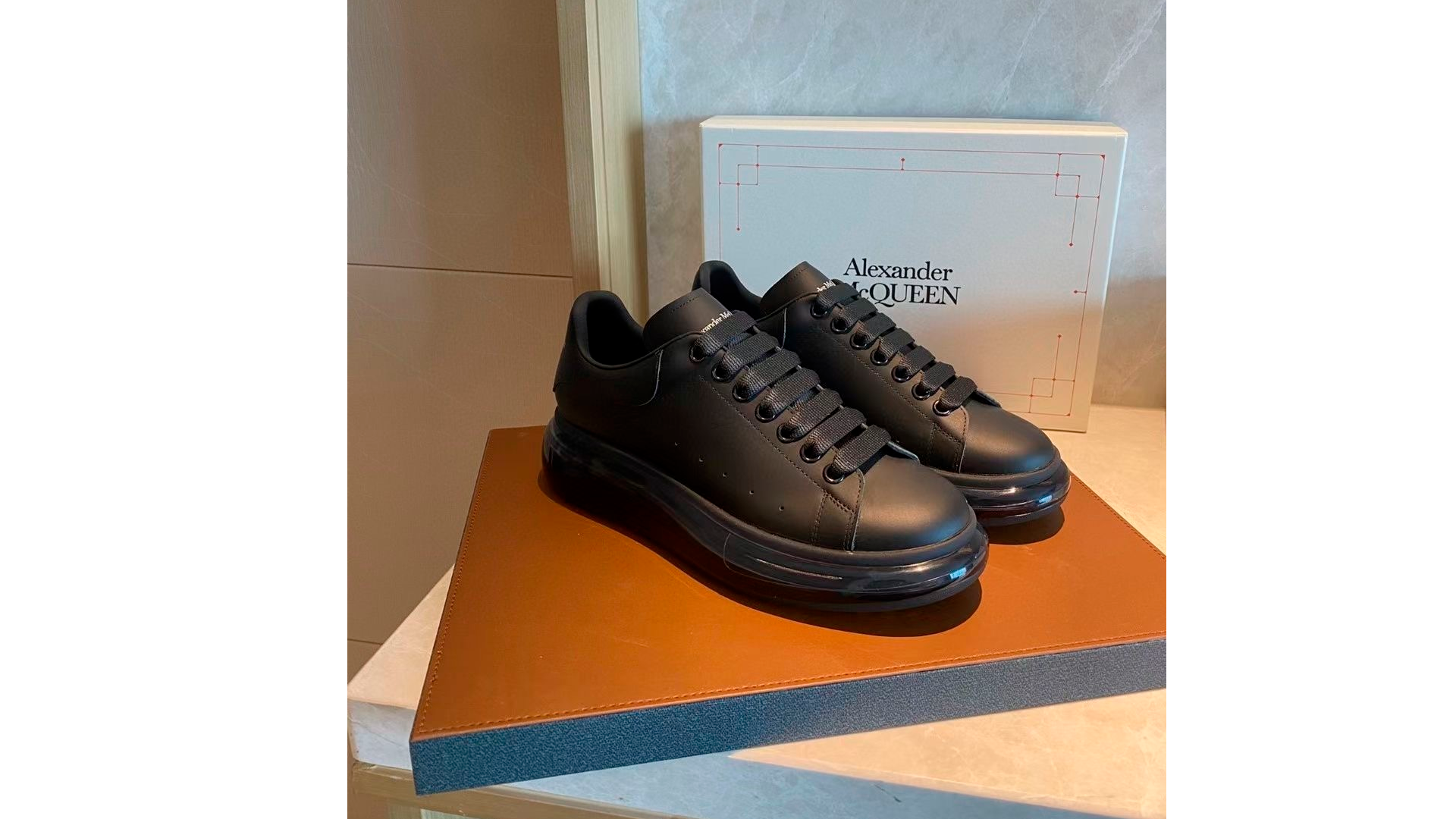 Alexander McQueen Oversized Sneakers – sleek all-black design in smooth leather with the iconic exaggerated sole and transparent detail. A bold, modern statement piece that redefines everyday luxury.