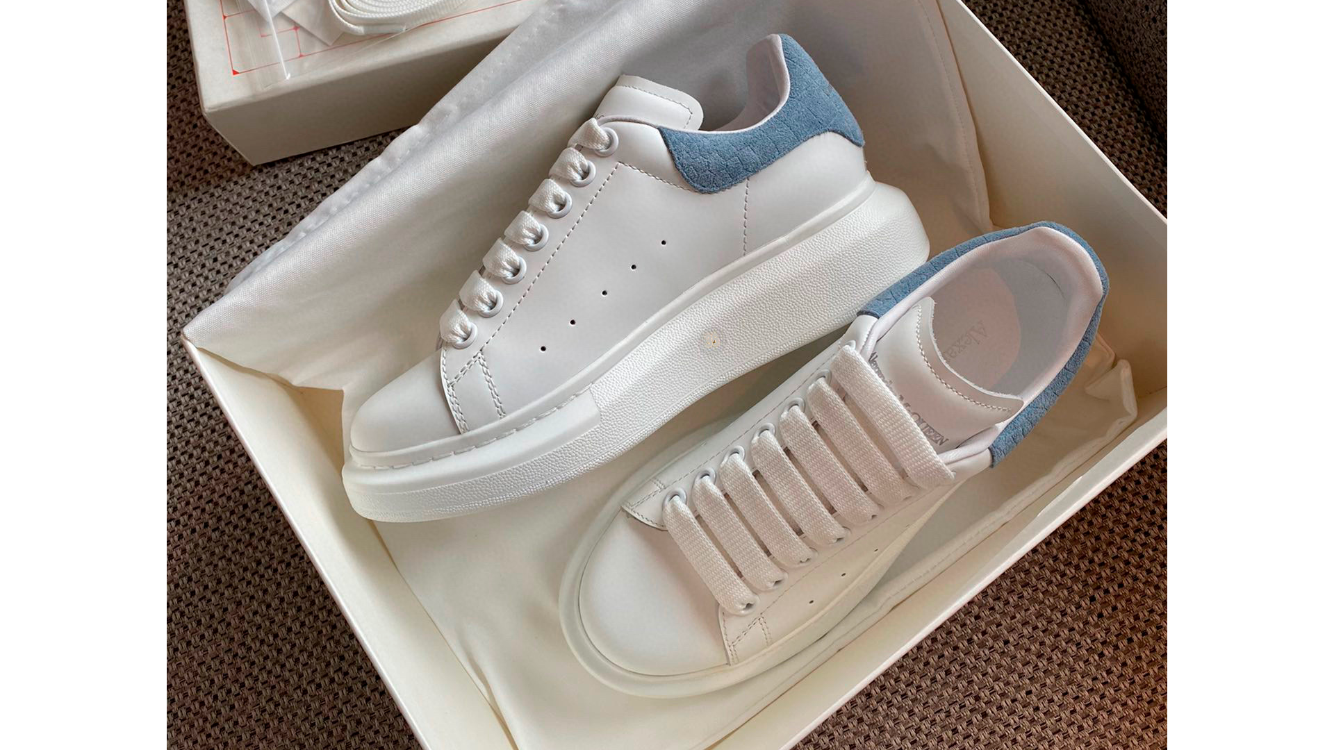 Alexander McQueen Oversized Sneakers – smooth white leather with a soft blue suede heel tab and the iconic oversized sole. A fresh, versatile design that brings a subtle touch of color to McQueen’s signature luxury sneaker.