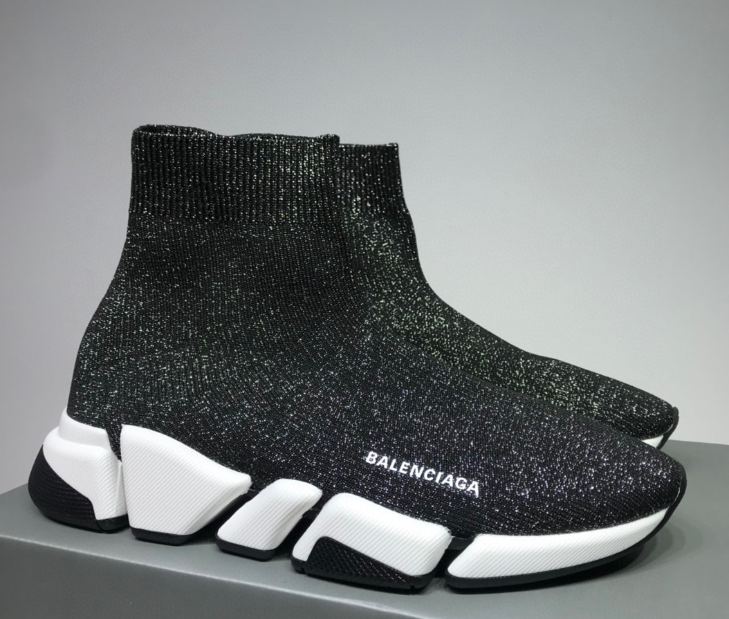 The Balenciaga Speed Trainer Glitter in black adds a sparkling twist to the iconic sock sneaker. Designed with a stretch-knit upper infused with subtle glitter, it combines a snug fit with standout style. Featuring the Balenciaga logo on the side and a lightweight sculpted sole in black and white, this sneaker delivers both comfort and bold sophistication.