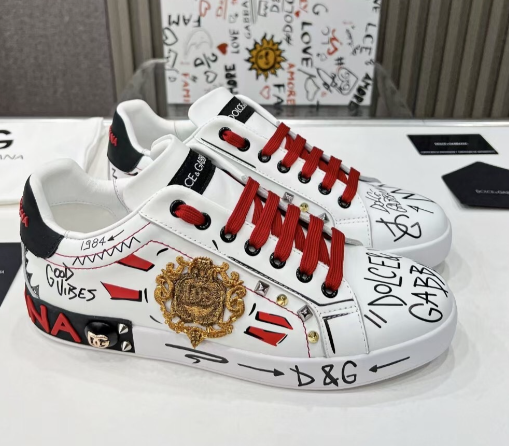 xpress bold luxury with the Dolce & Gabbana Portofino Graffiti sneakers. Crafted in smooth white leather, this edition features hand-drawn graffiti-style graphics, striking red laces, and a 3D embroidered gold crest on the side. With contrasting black and red accents and a classic rubber sole, these sneakers fuse urban creativity with Dolce & Gabbana’s unmistakable Italian craftsmanship.